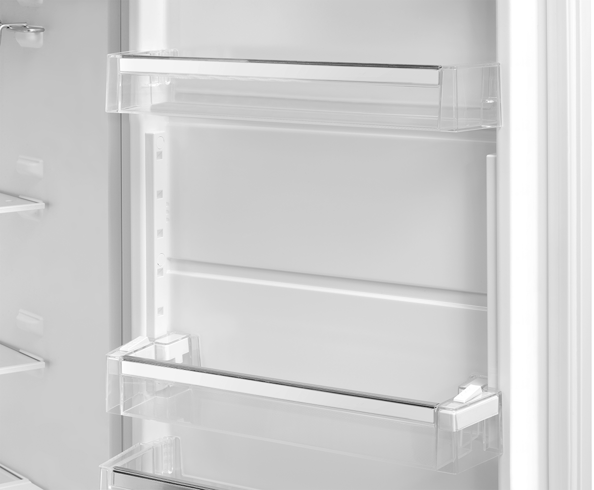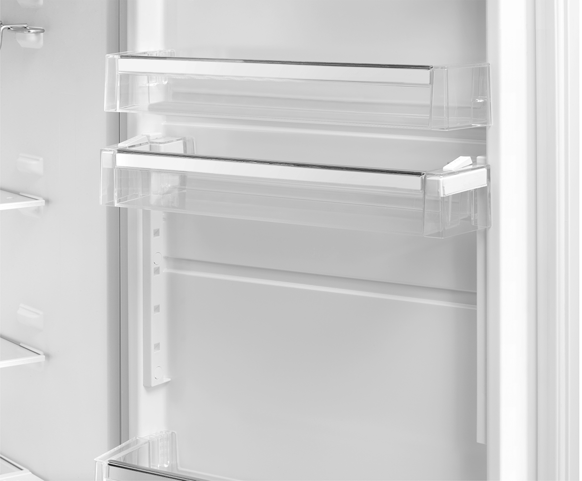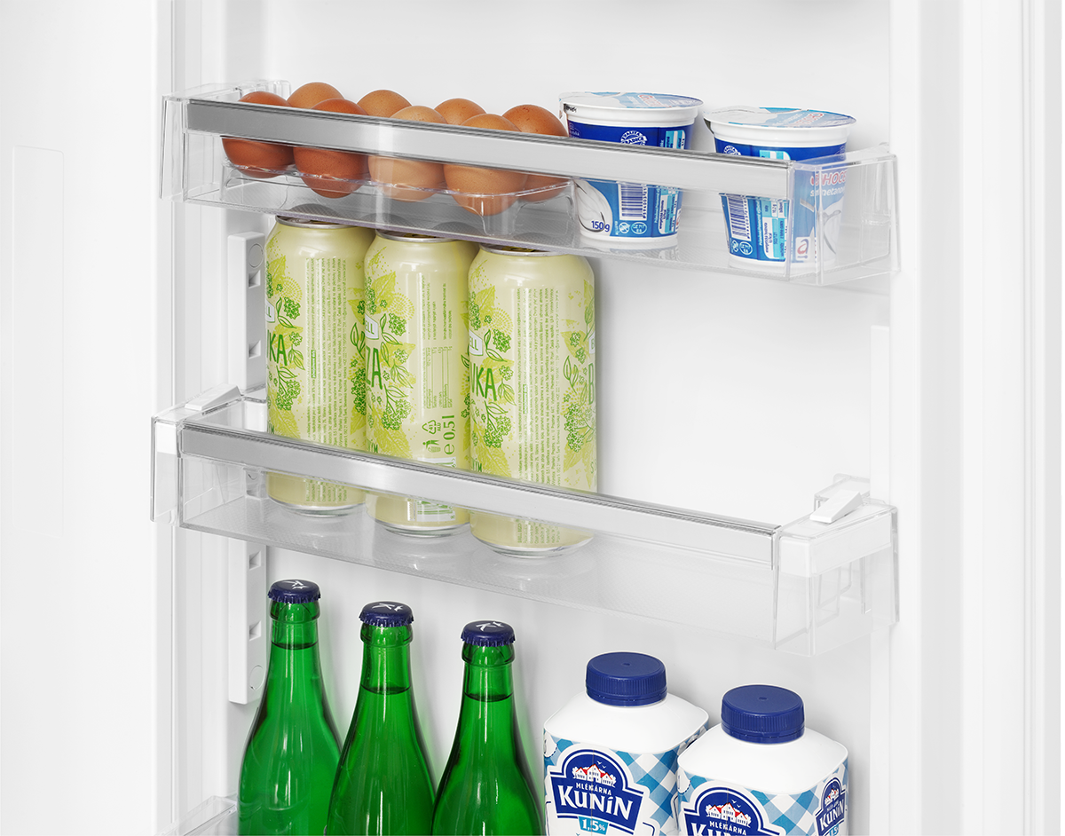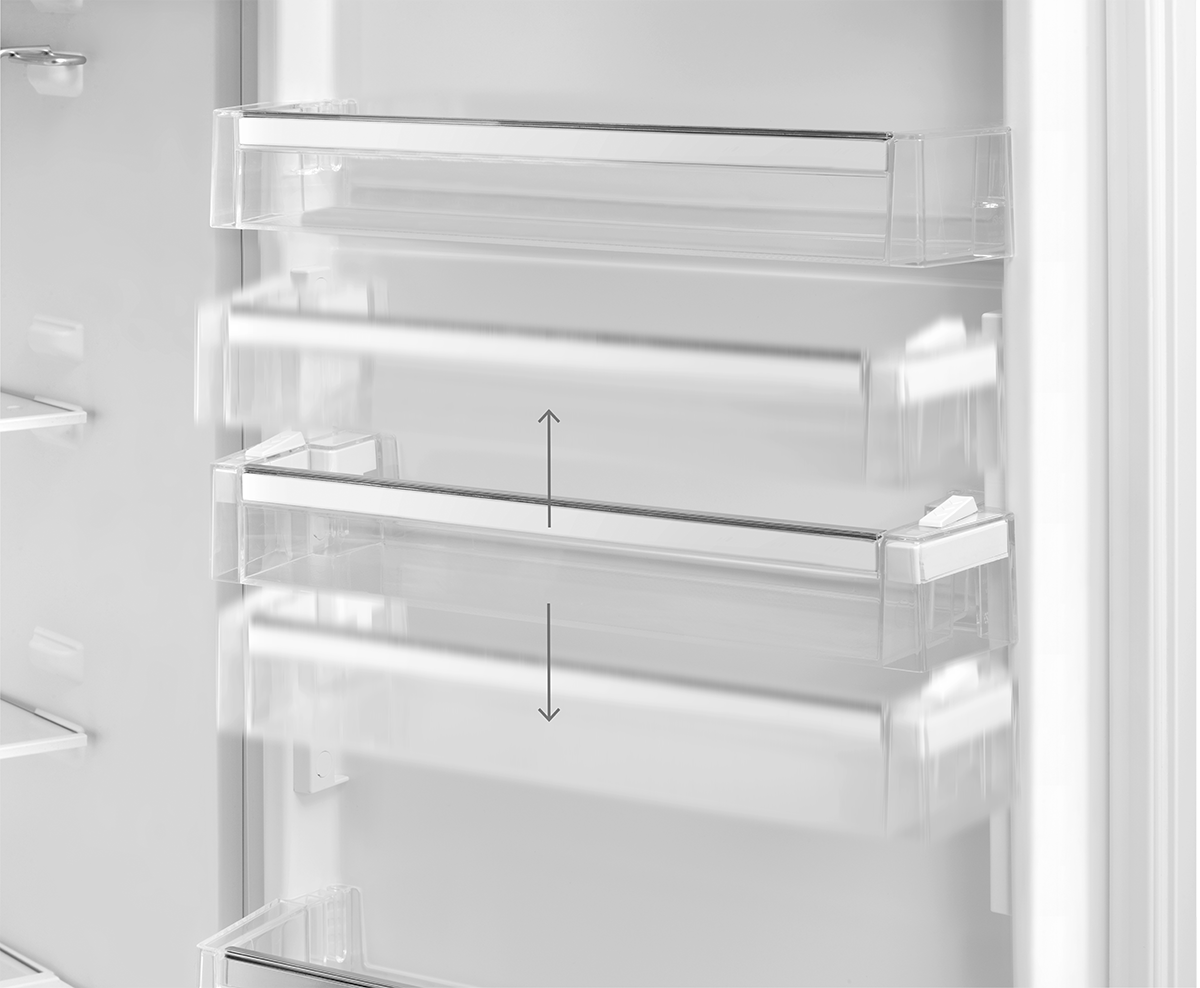 W drzwiach lodówki znajduje się półka, którą można płynnie przesuwać wzdłuż prowadnicy drzwi, nawet gdy jest pełna. Umożliwia efektywne wykorzystanie przestrzeni w drzwiach, ponieważ w łatwy sposób możesz ustawić żądaną wysokość.