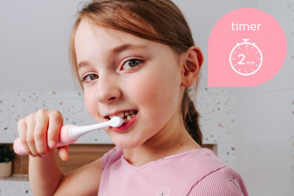Szczoteczka wyposażona jest w inteligentny timer, który pomaga dzieciom równomiernie rozplanować czas szczotkowania. Co 30 sekund informuje o konieczności przejścia do kolejnej części jamy ustnej, co zapewnia równomierne czyszczenie. Po 2 minutach – zalecanym czasie mycia – szczoteczka automatycznie się wyłącza.